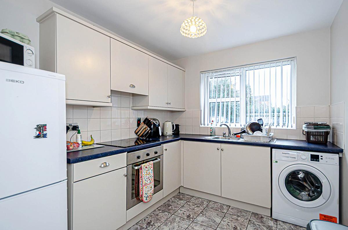The modern fitted kitchen is well designed, offering ample storage and worktop space, with space for dining, making it both practical and sociable.