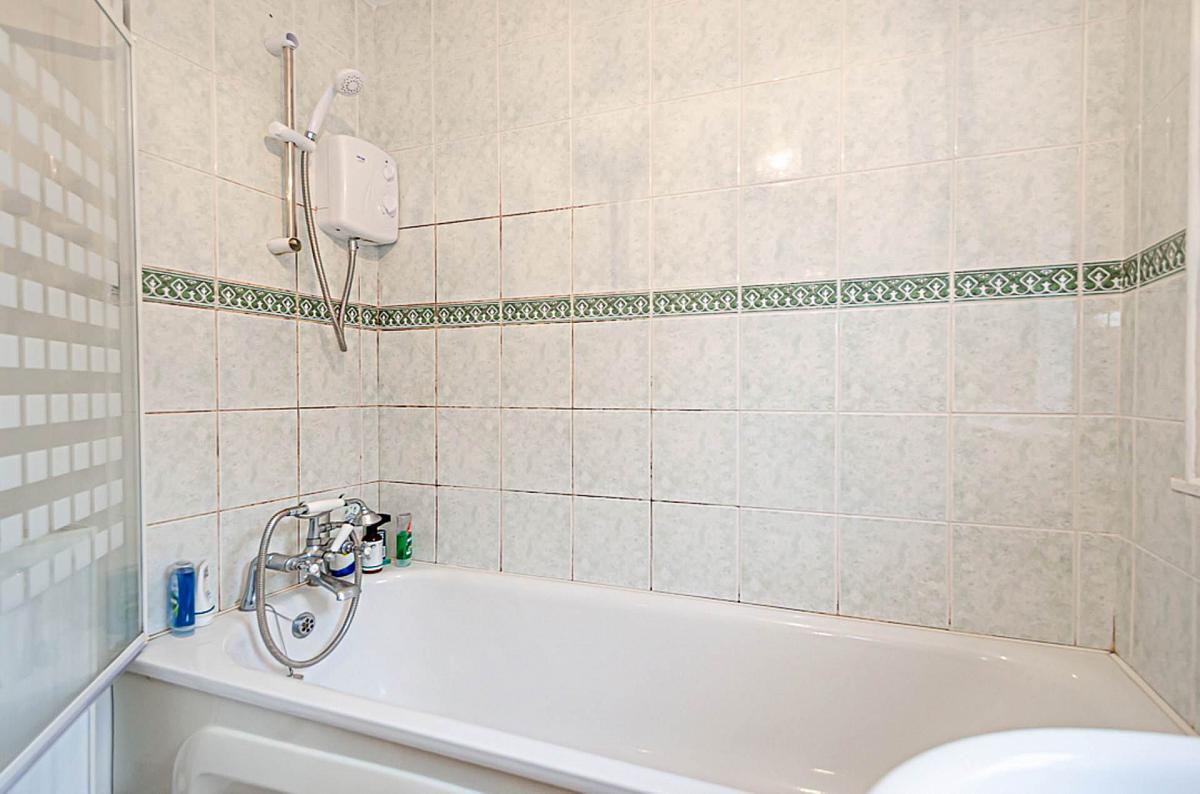 White suite with electric shower and screen over bath, wash hand basin, W.C., part tiled walls, ceramic tiled floor, and extractor fan