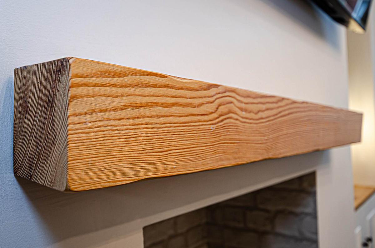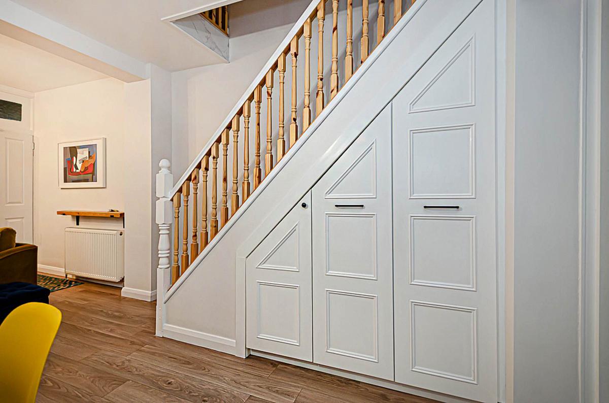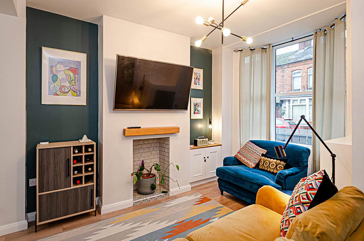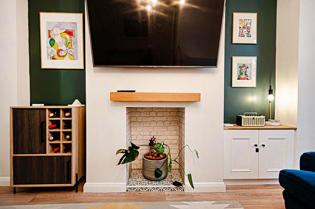 Hole-in-the-wall fireplace with tiled hearth and timber mantle, bespoke storage under stairs, bay window, timber laminate floor and antique style lighting