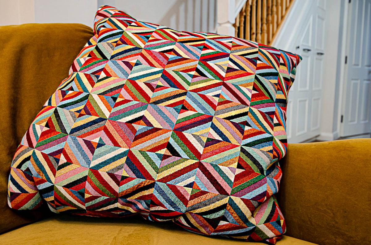 Open plan living area with bay window and bespoke storage