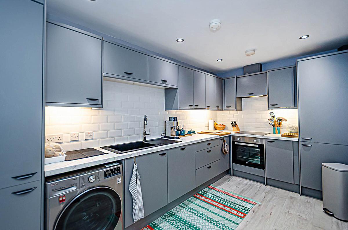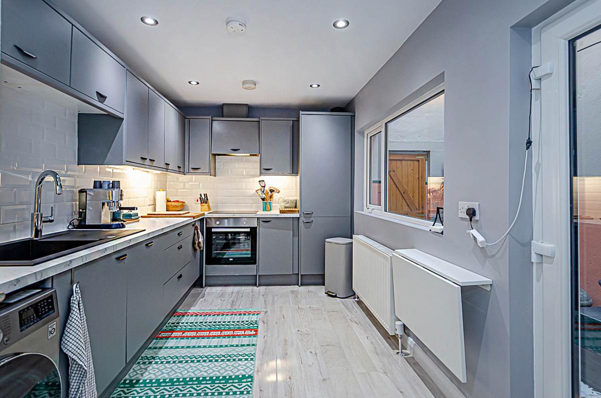 Range of high and low level fitted units in grey finish, stainless steel oven, ceramic hob, concealed extractor canopy, black sink with with chrome tap, integrated fridge freezer, integrated dishwasher, part tiled walls, timber laminate floor, down lighters, recessed spotlights, fold down breakfast table, and gas boiler in cupboard