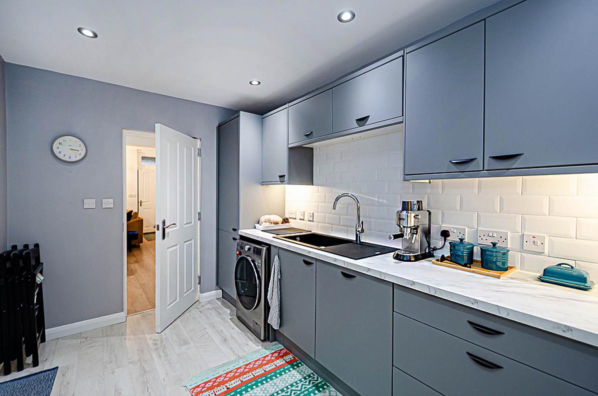 The heart of the home is the stunning open-plan living space, flooded with natural light and enhanced by an attractive bay window and a stylish hole-in-the-wall fireplace. Bespoke fitted storage has been expertly incorporated, combining sleek design with everyday practicality. The contemporary grey-finished kitchen is both modern and functional, featuring a comprehensive range of integrated appliances and providing an ideal setting for both daily living and entertaining.