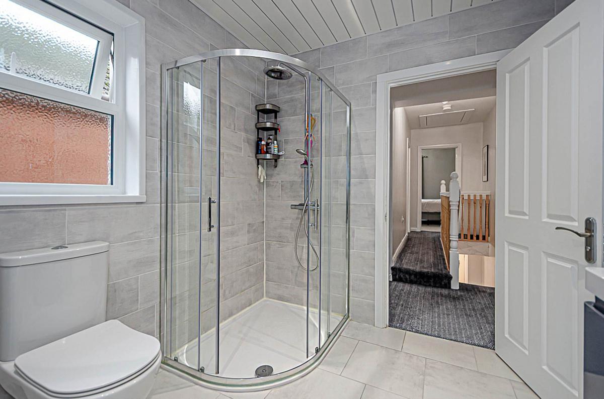 White suite - bath with side mounted taps, wash hand basin in large 2 drawer vanity unit, W.C., large shower cubicle with thermostatic shower, dual shower heads, and sliding doors, modern tiled walls, ceramic tiled floor, P.V.C. panelled ceiling and recessed spotlights, and modern extractor fan