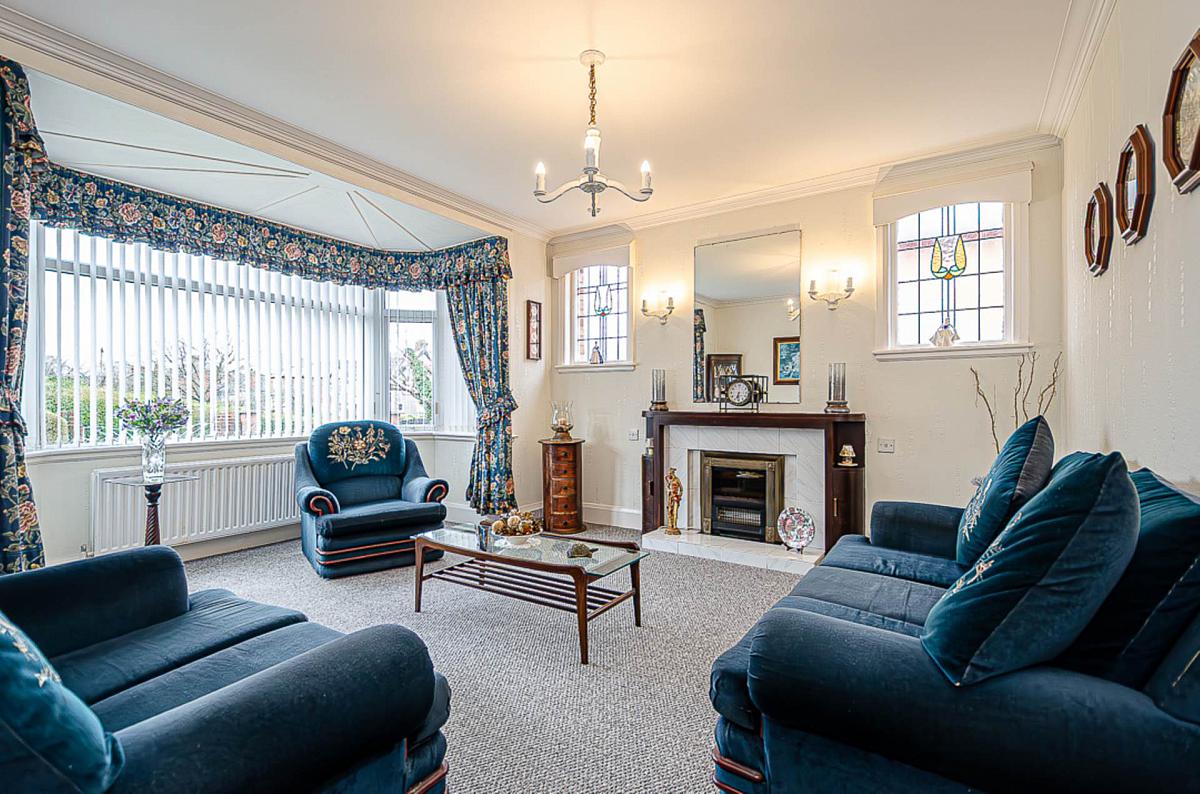 Living room with bay window and Sitting room with wood burner