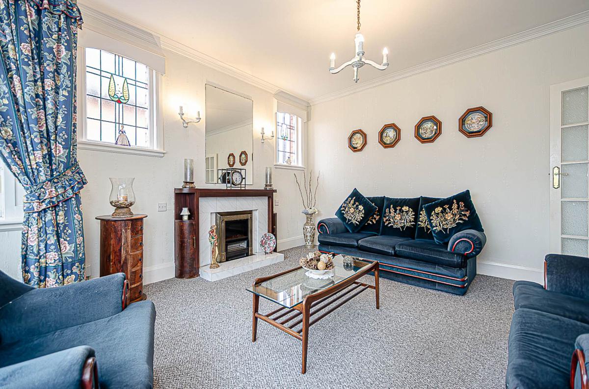 Bay window with original timber panelling, tiled fireplace with timber surround, cornice, and stained glass windows