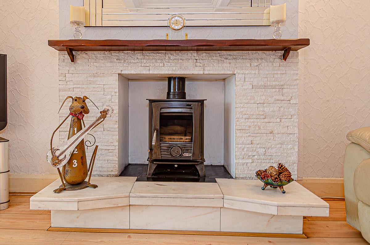 Feature tiled fireplace with wood burner, cornice, timber detailing on ceiling, wall lighting, timber laminate floor and sliding doors to