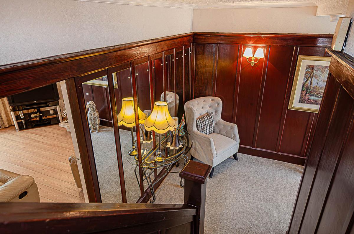 Upon entering, a welcoming entrance hall immediately impresses with its original timber panelling, setting the tone for the character and warmth found throughout the home. The ground floor boasts two generous reception rooms, including a bright and spacious living room enhanced by a classic bay window, and a cosy sitting room complete with a charming wood burner ideal for relaxing evenings.