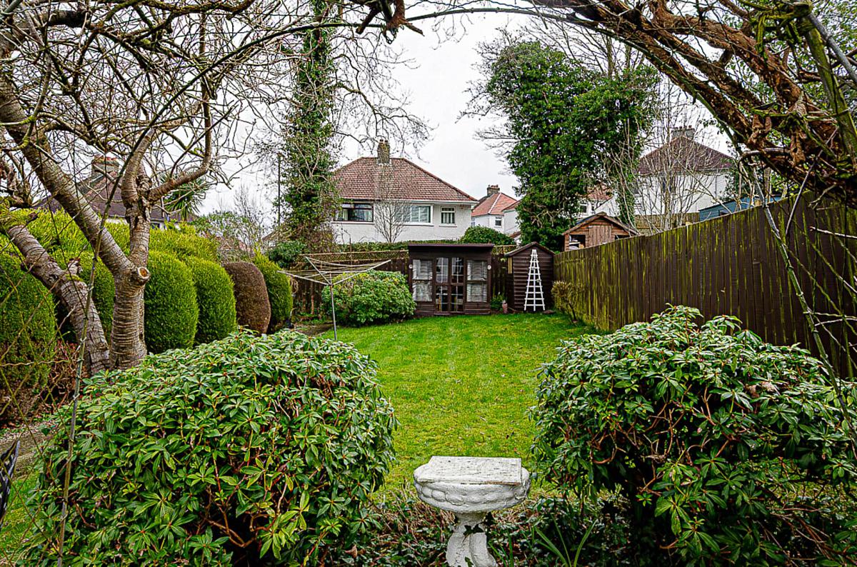 Rear garden in paving, lawn, shrubs and trees with garden room and garden shed
