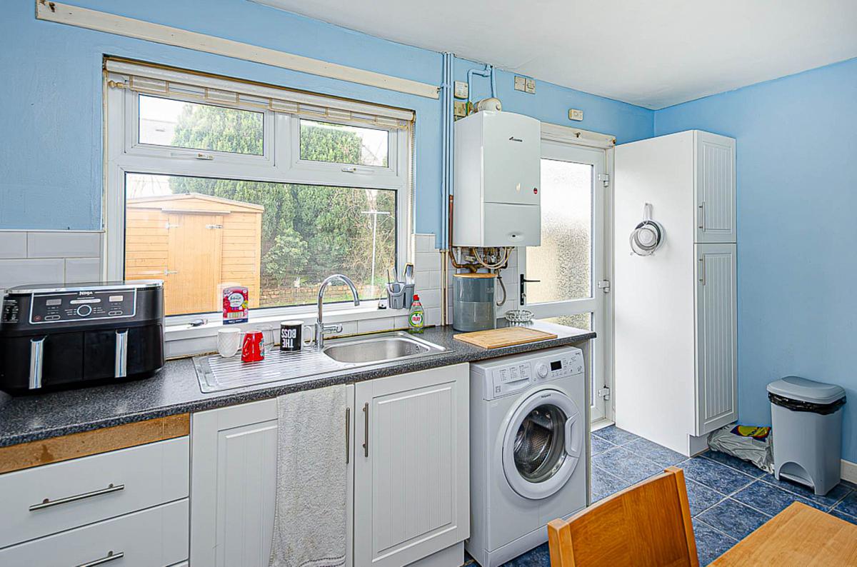 Range of high and low level units, stainless steel sink, part tiled walls, ceramic tiled floor, gas boiler and plumbing for washing machine
