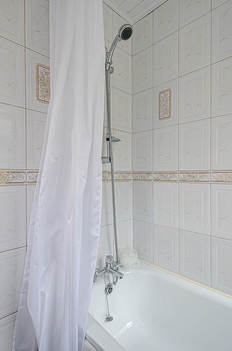 White suite with shower attachment over bath, wash hand basin, W.C., tiled walls, ceramic tiled floor, and timber panelled ceiling