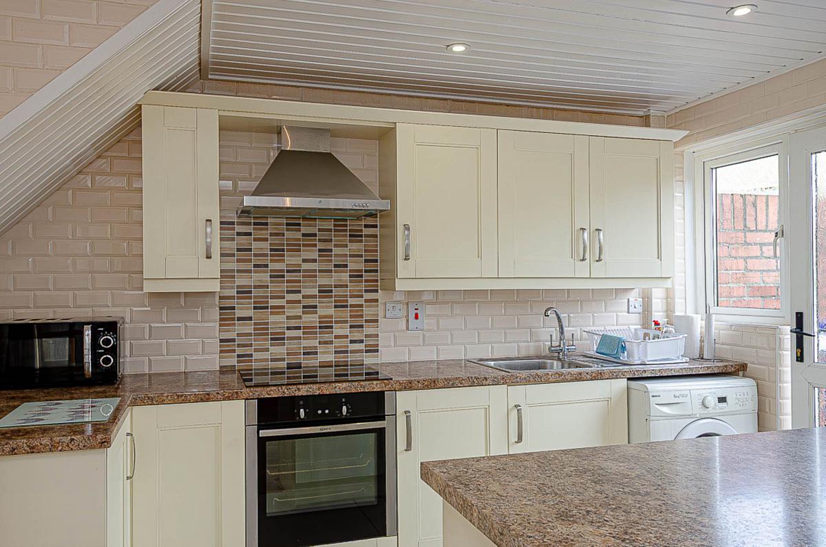 Modern range of high and low level fitted units, stainless steel oven, ceramic hob, stainless steel extractor canopy, stainless steel sink with mixer tap, part tiled walls, ceramic tiled floor, peninsula unit, and recessed spotlights