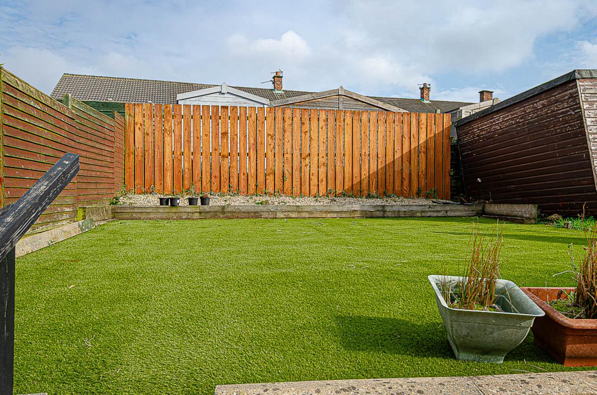 Front garden in brick paved path and artificial grass. Rear garden in paving, artificial grass, raised shrubs beds and outside storage