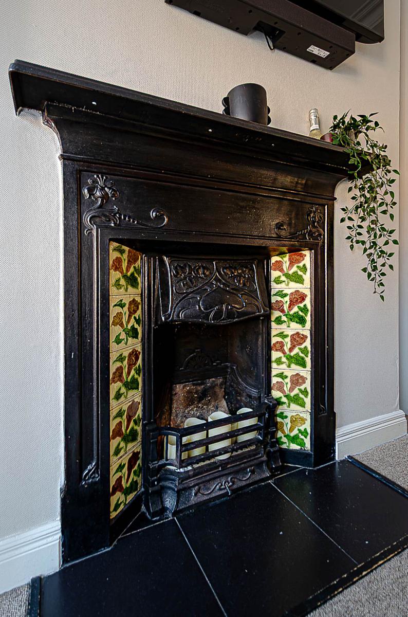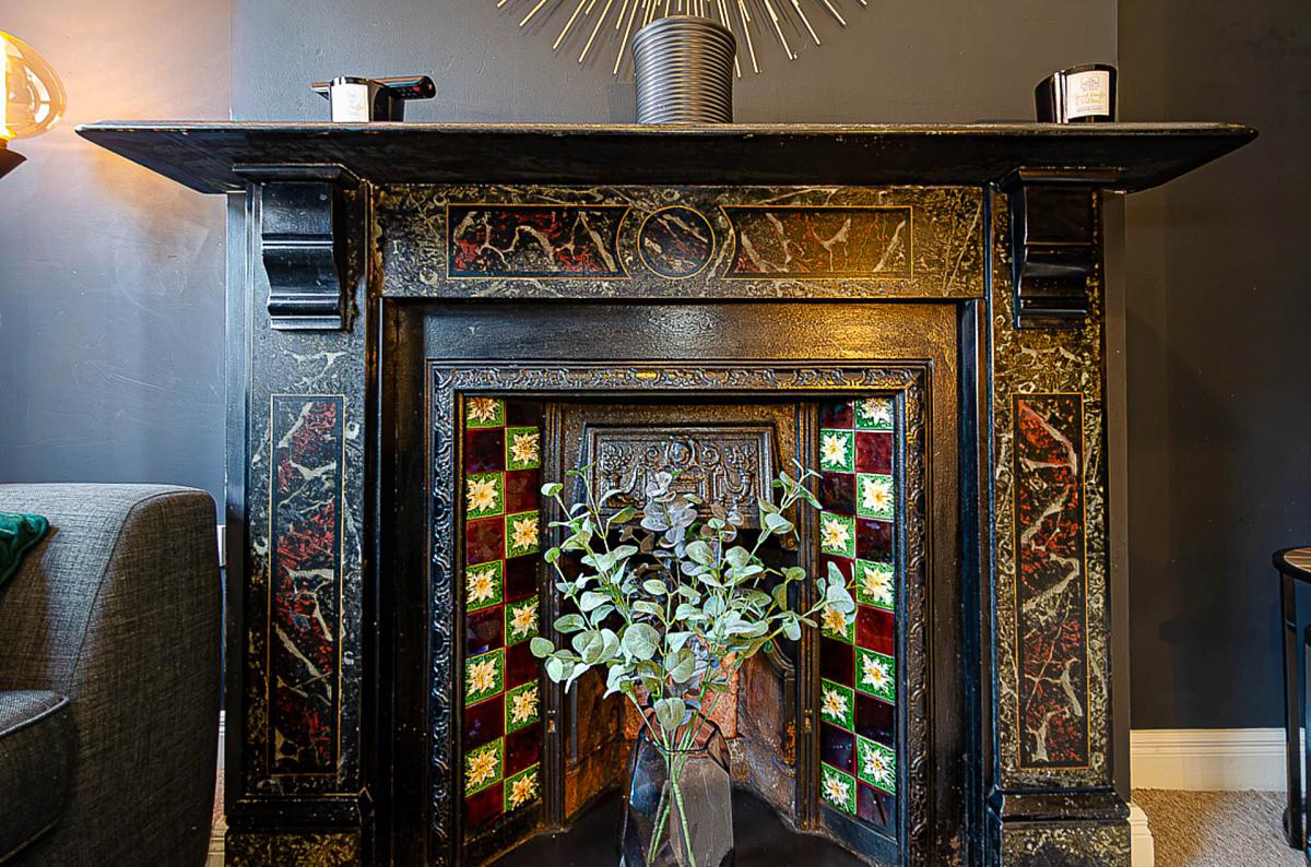 Modern timber panelling, cornice and feature cast iron fireplace with tiled inset