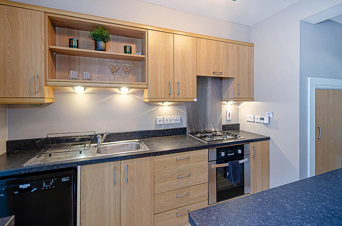 Range of high and low level fitted units, stainless steel oven, gas hob, stainless steel splashback, concealed extractor canopy, stainless steel sink, down lighting, island unit with space for seating, large Velux window in vaulted ceiling, spotlights, ceramic tiled floor and plumbing for washing machine
