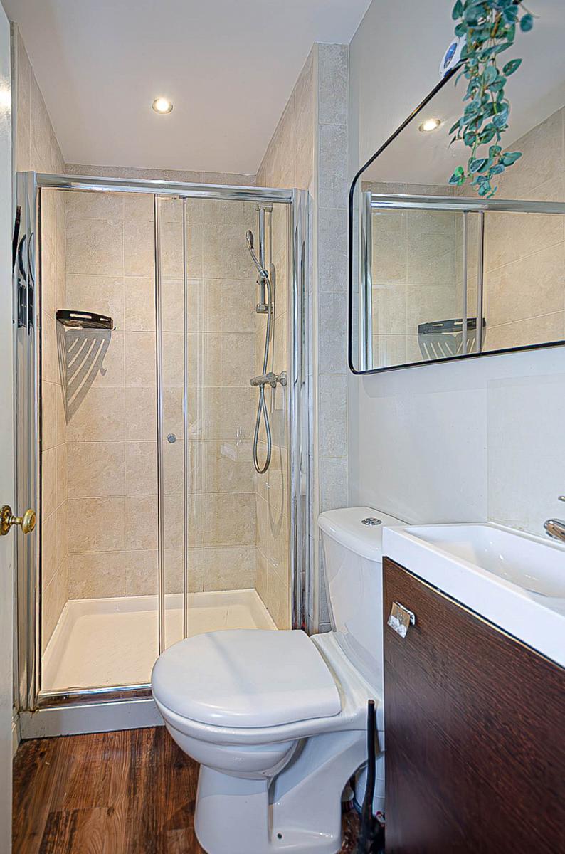 Shower cubicle with thermostatic shower and sliding door, wash hand basin in vanity unit, W.C., timber laminate floor, recessed spotlights and extractor fan