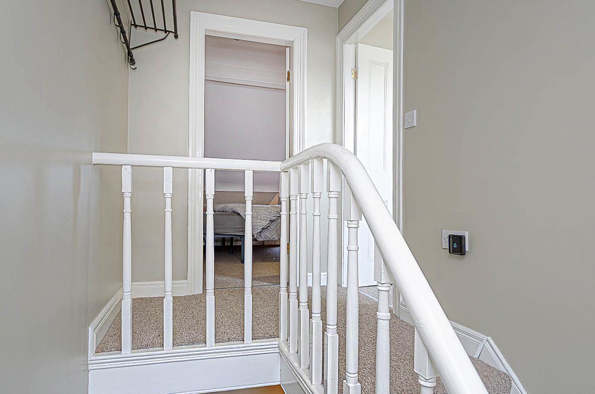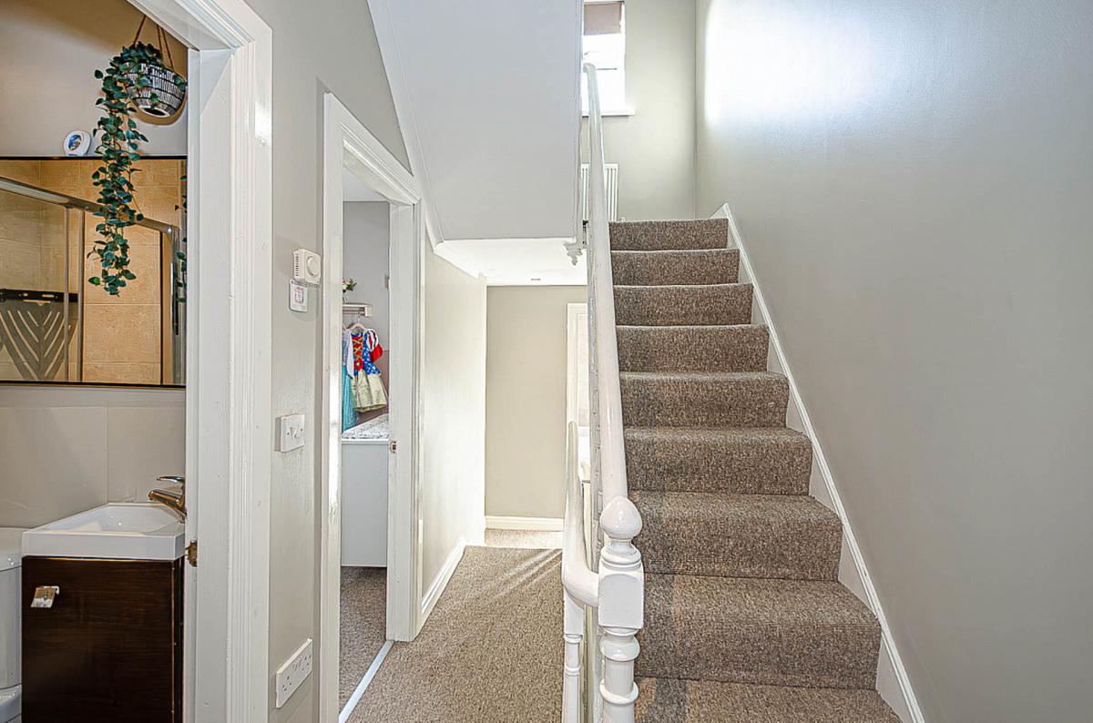 Timber laminate floor, wall hung electric electric fire, recessed spotlights, and storage under stairs