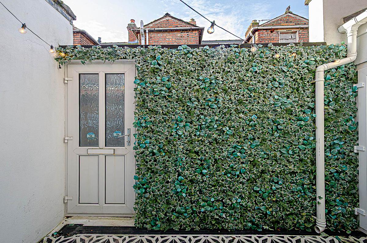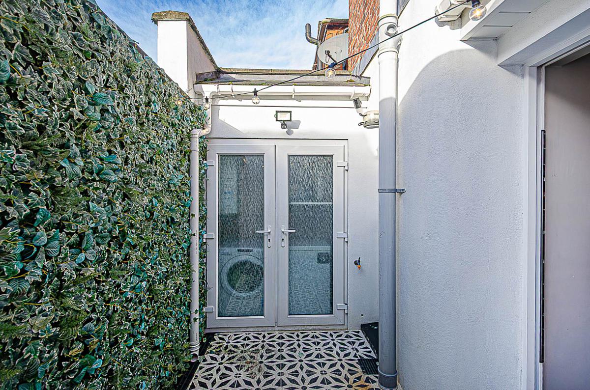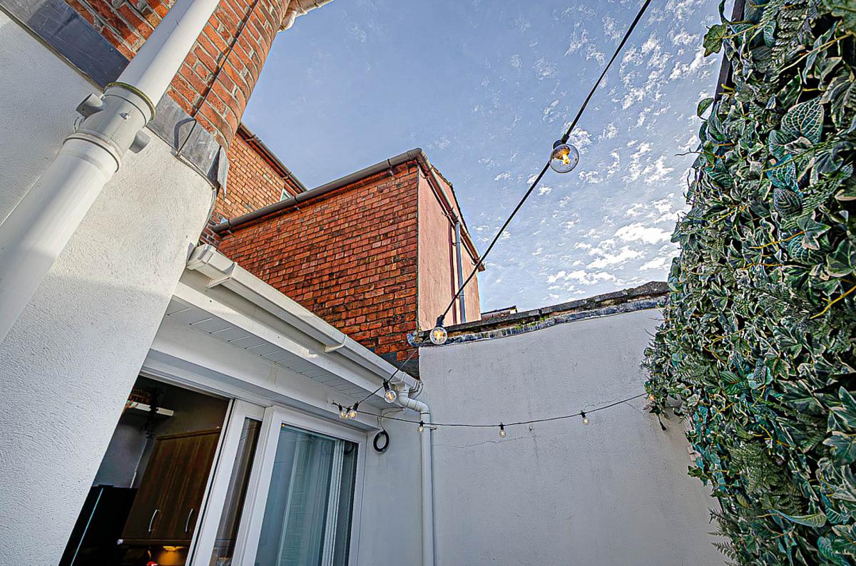 Enclosed rear yard in decorative tiling with outside store - light, power, gas boiler and plumbing for washing machine