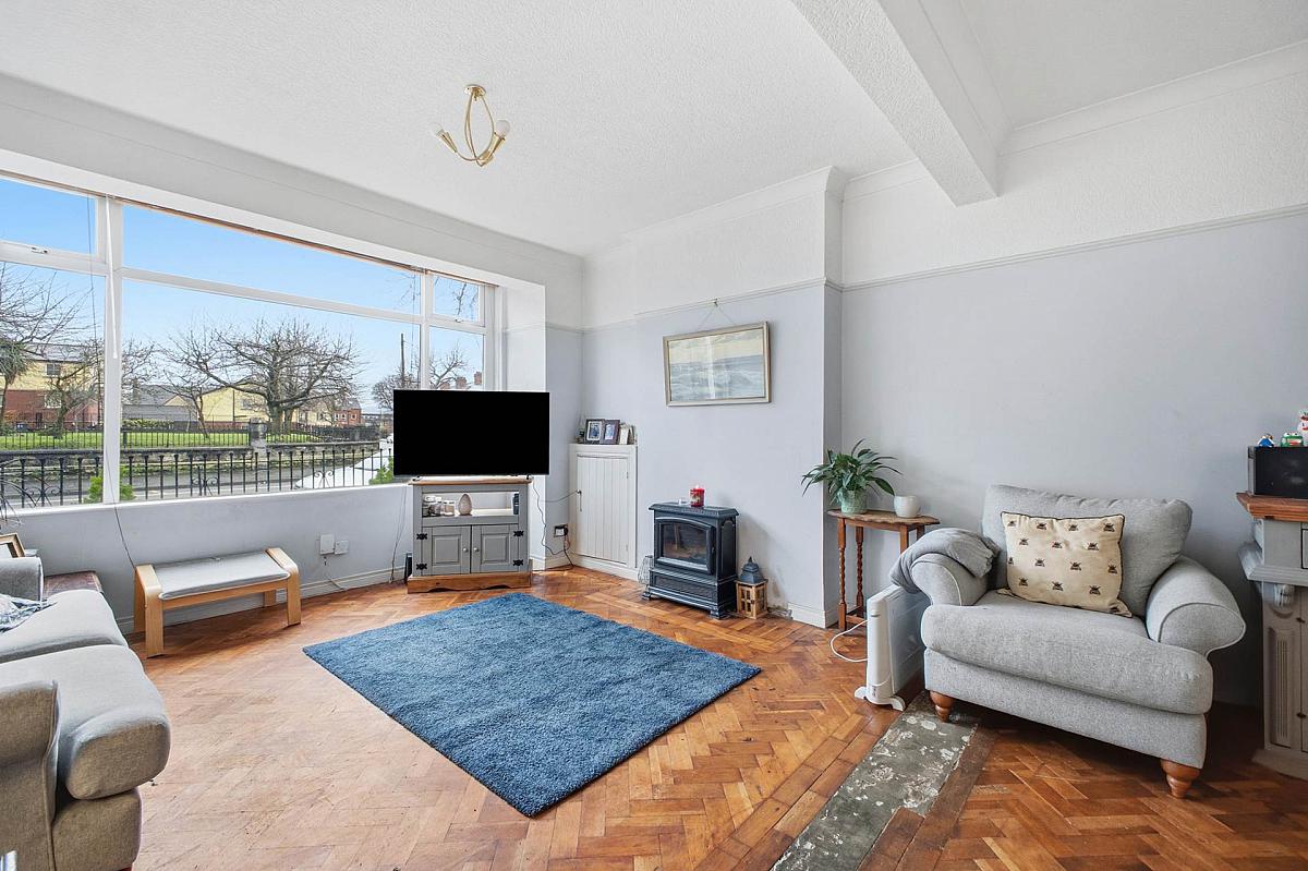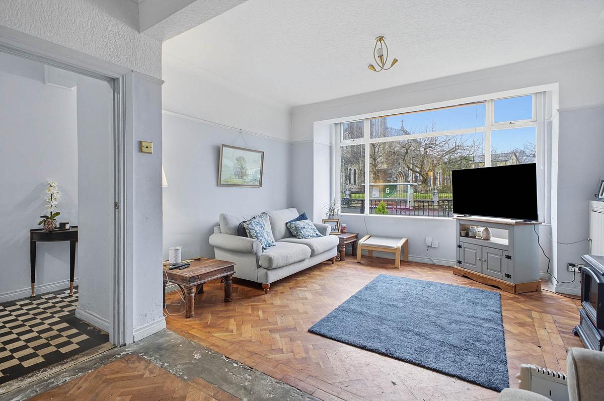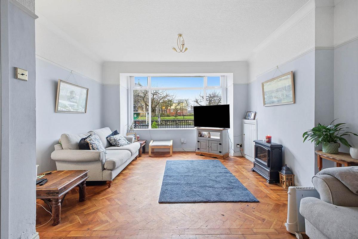 The property welcomes you via an inviting entrance hall, complete with a striking black and white tiled floor, making a stylish first impression. A generous living room features elegant parquet flooring and a charming bay window, filling the space with natural light and creating a warm, welcoming atmosphere.