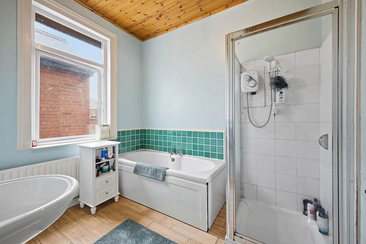 To the rear, the extended kitchen and dining area form a superb social hub, offering ample preparation space and room for dining, ideal for entertaining or family living. Three well-proportioned bedrooms occupy the first floor, complemented by a family bathroom with a separate shower cubicle, combining practicality with comfort.