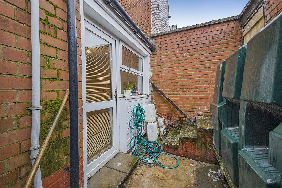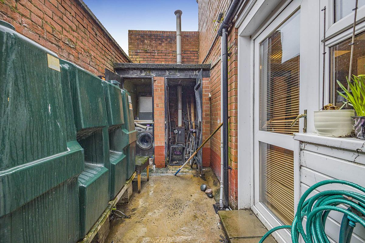 Forecourt in paving and enclosed rear yard with oil fired boiler and utility shed with plumbing for washing machine