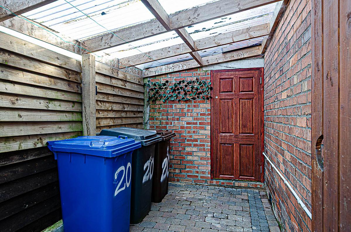 Brick paved forecourt and covered yard. Rear garden in paving with oil boiler in housing and storage tank