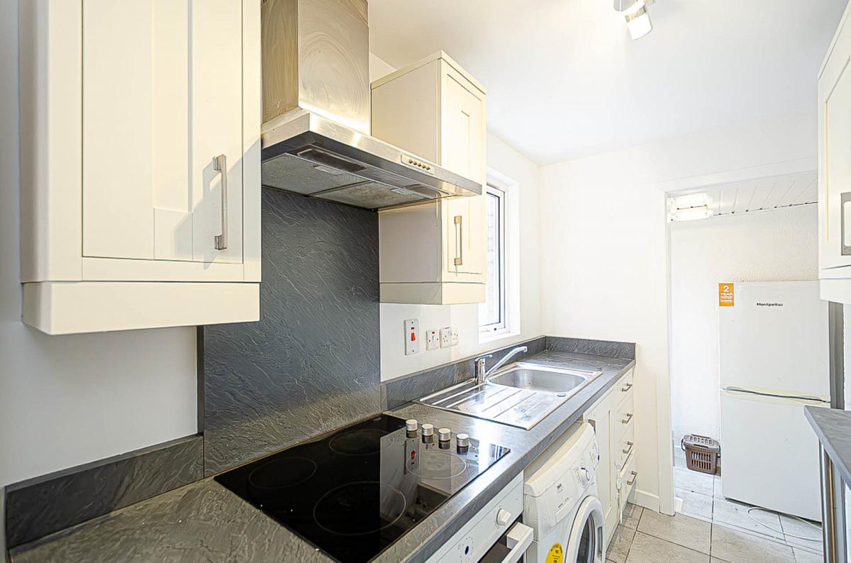 To the rear, a modern fitted kitchen offers ample storage and worktop space, complemented by integrated appliances and room for a dining table. French doors provide direct access to a good-sized south-facing garden, thoughtfully laid with decorative stones for low-maintenance enjoyment and maximum sunshine throughout the day.