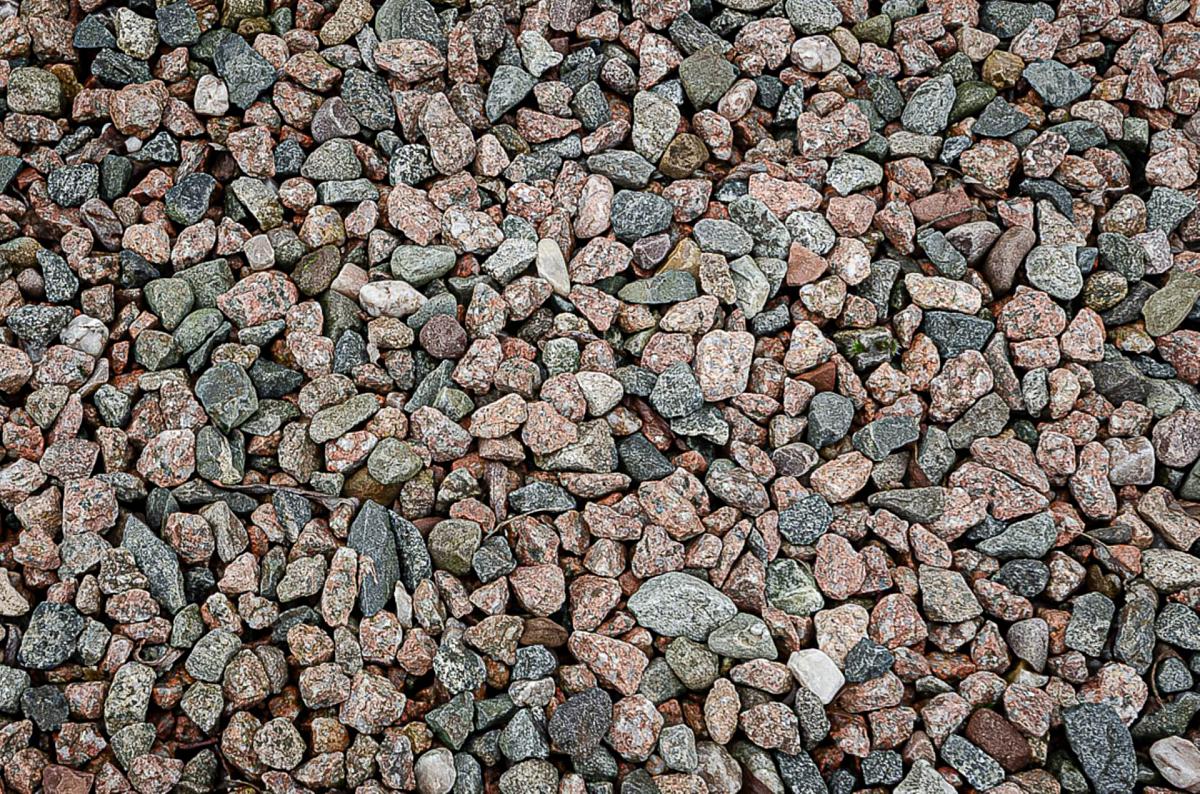 Front garden in small stones, concrete driveway, and steps to entrance porch