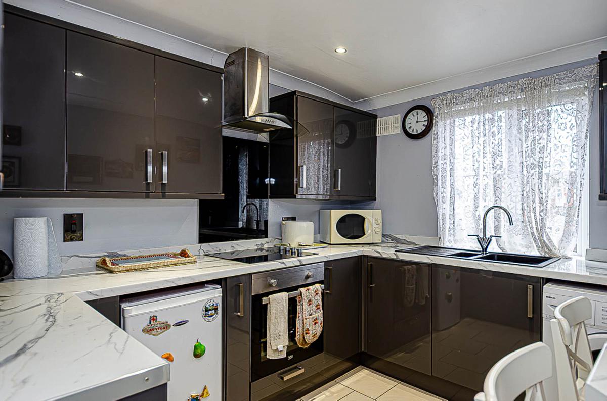 The modern kitchen is finished in a sleek grey design, offering a clean, contemporary aesthetic complemented by excellent storage and generous workspace.