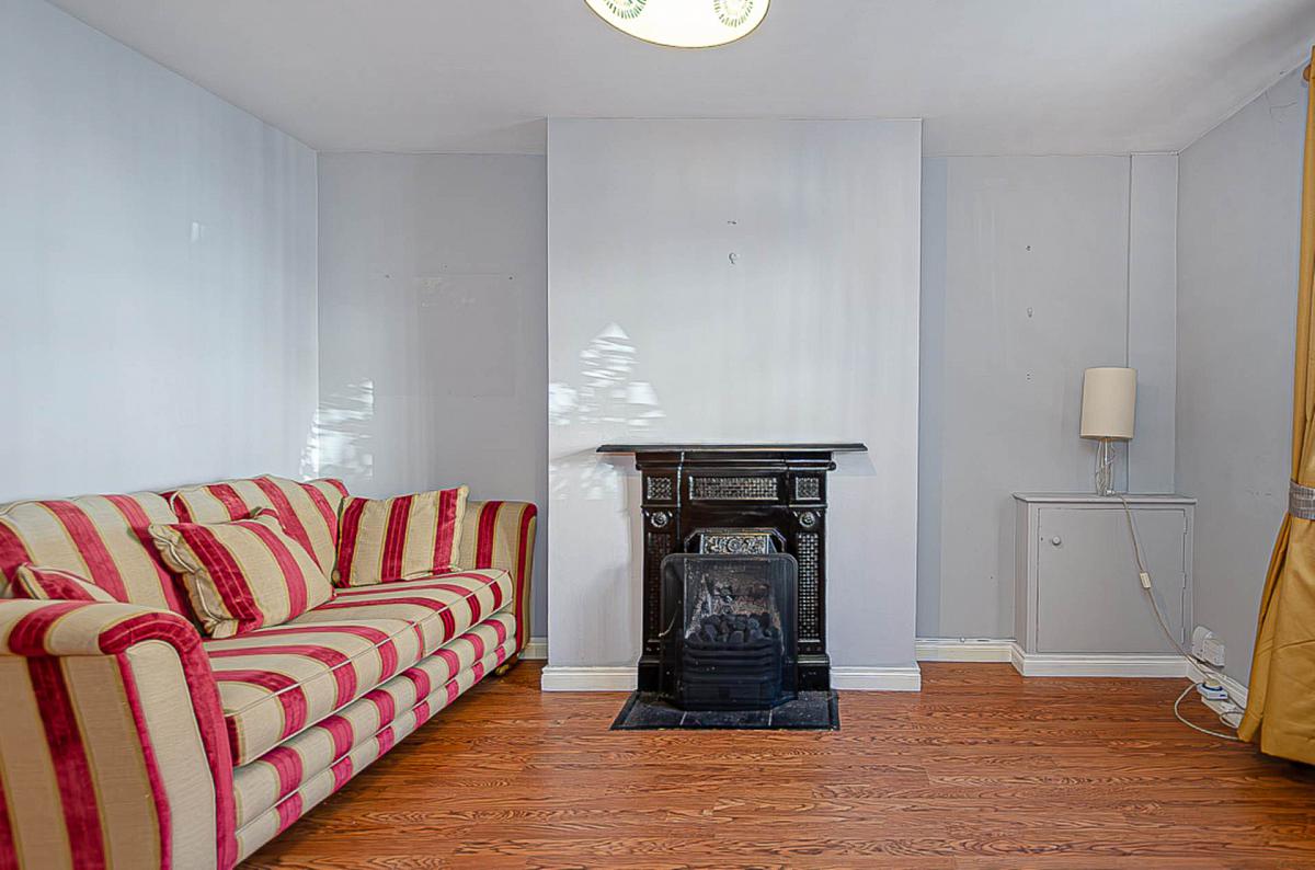 The property is entered through a welcoming entrance porch with attractive timber laminate flooring, leading into a bright and inviting living room featuring a characterful cast iron fireplace which provides a charming focal point.