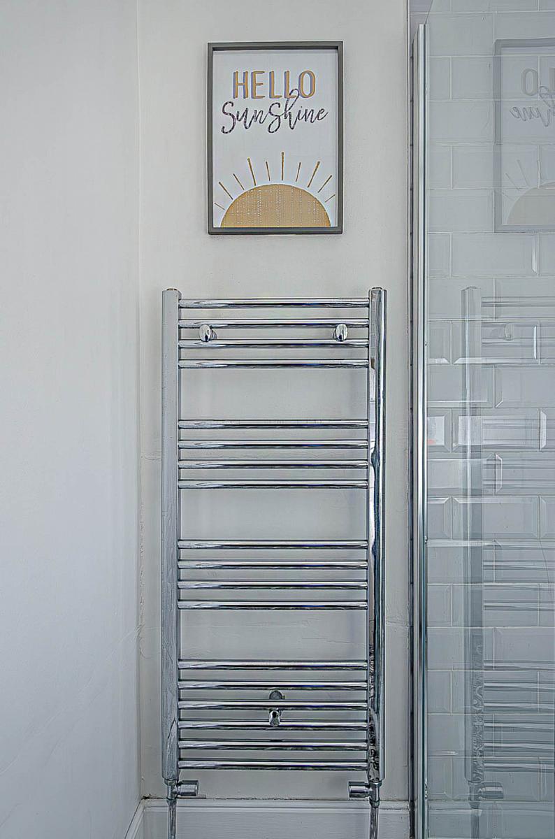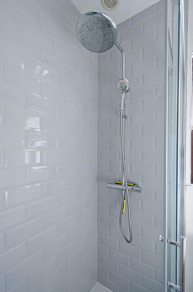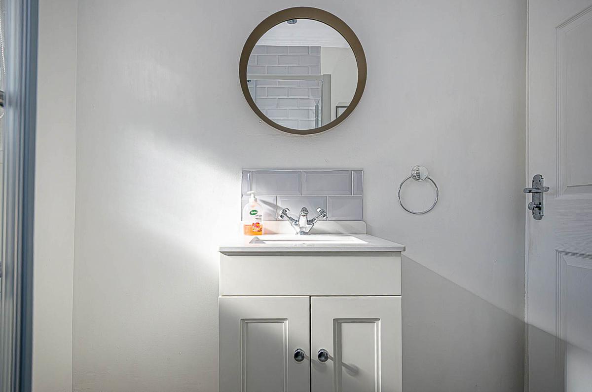 Large tiled shower cubicle with thermostatic shower and sliding door, wash hand basin in white vanity unit and tiled splashback, W.C., chrome towel rail radiator, recessed spotlight and extractor fan
