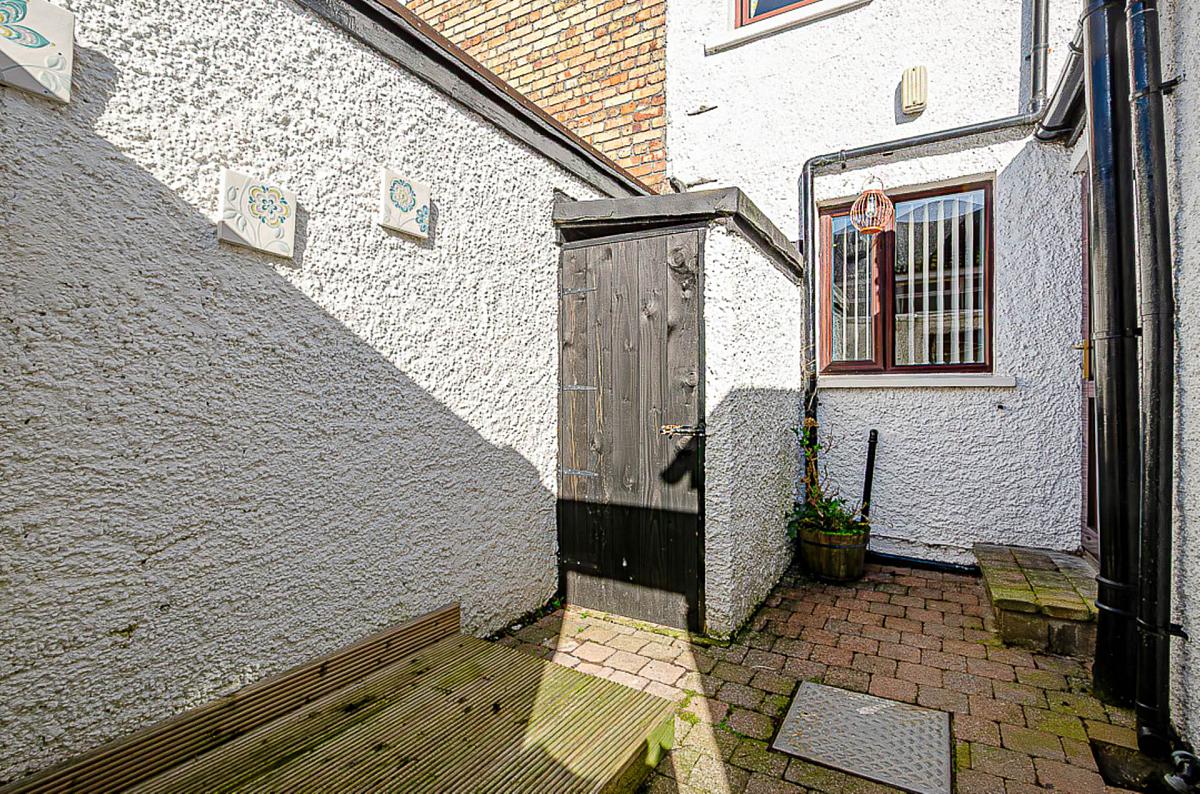 Forecourt in tiled path and small stones. Rear yard with brick paving, decked area and outside storage