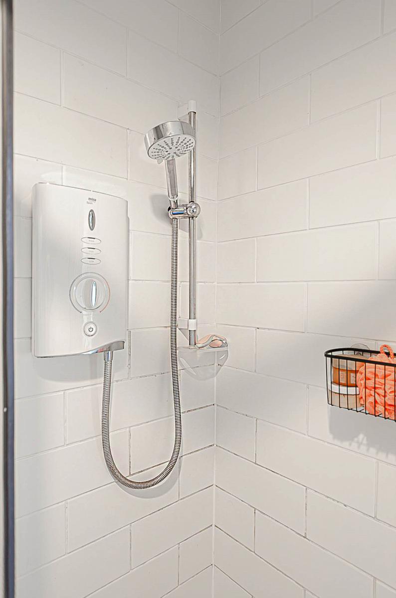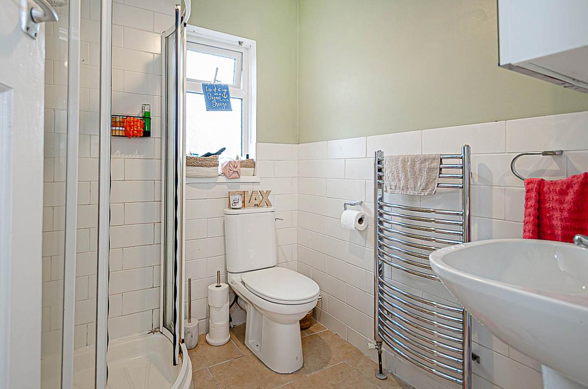 Comer shower cubicle with electric shower and sliding doors, wash hand basin, W.C. part tiled walls, ceramic tiled floor, chrome towel rail radiator, bathroom cabinet, and extractor fan