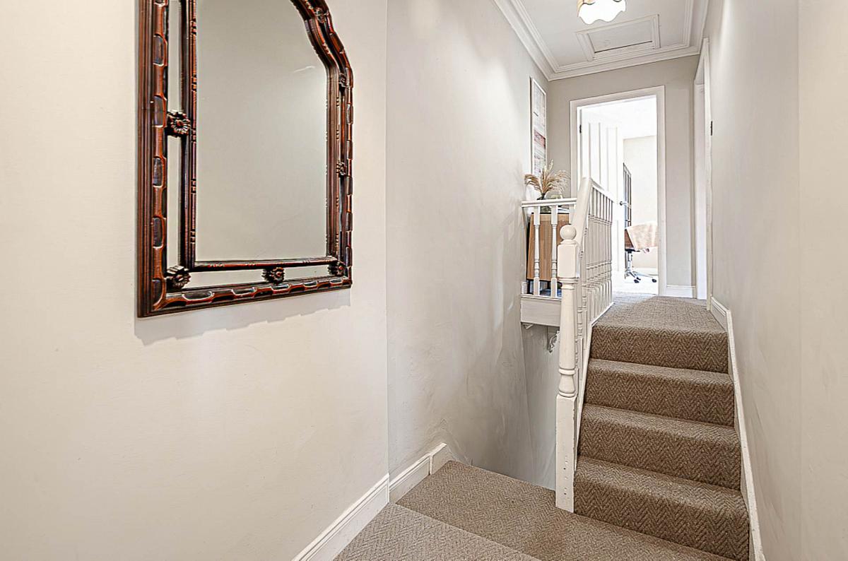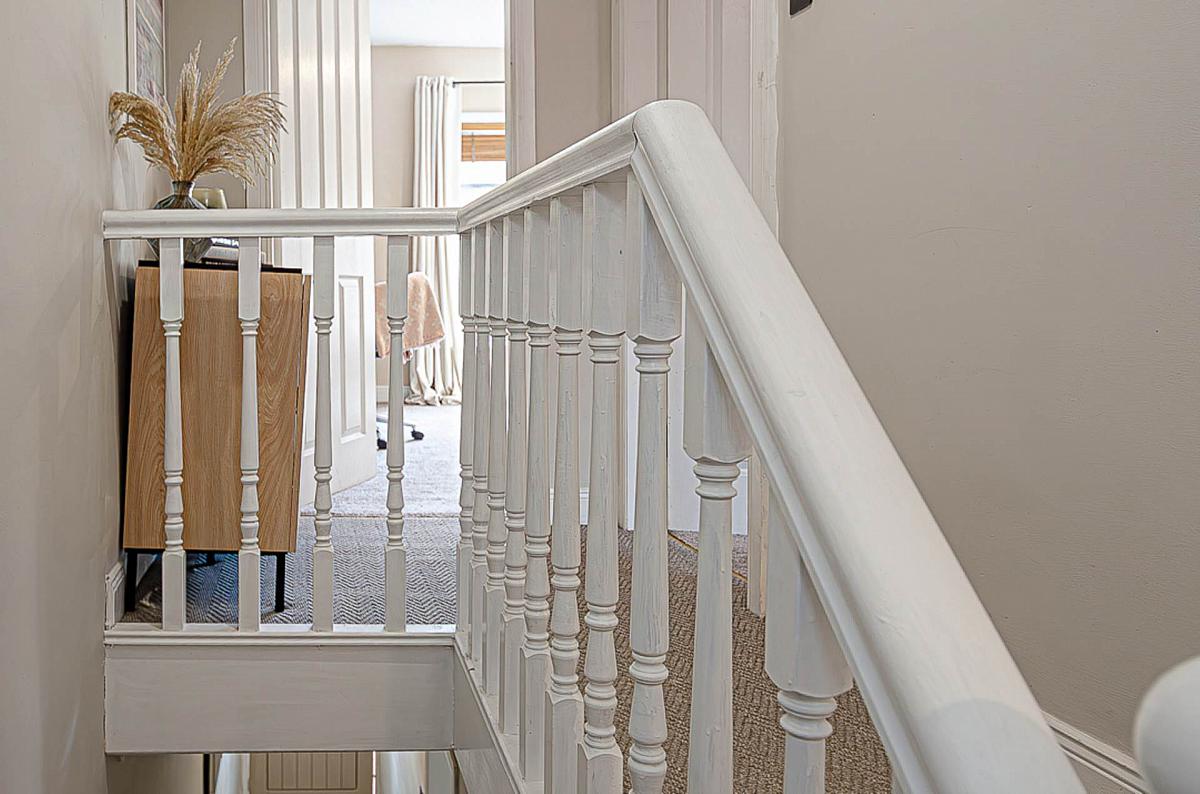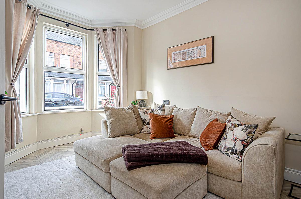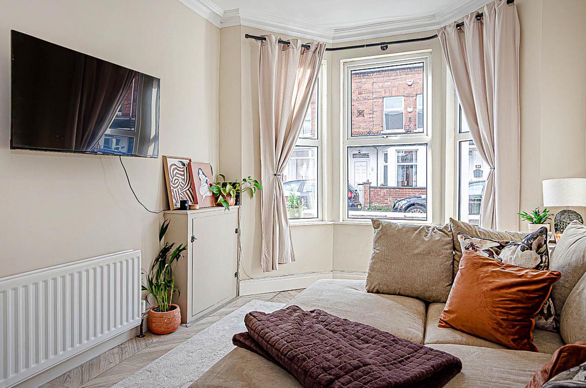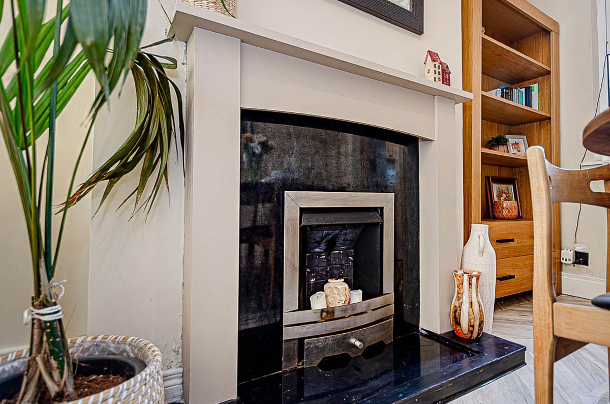 Bay window, cornice, feature fireplace, black electrical fittings, storage understairs and chevron style modern timber laminate floor