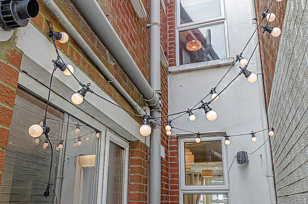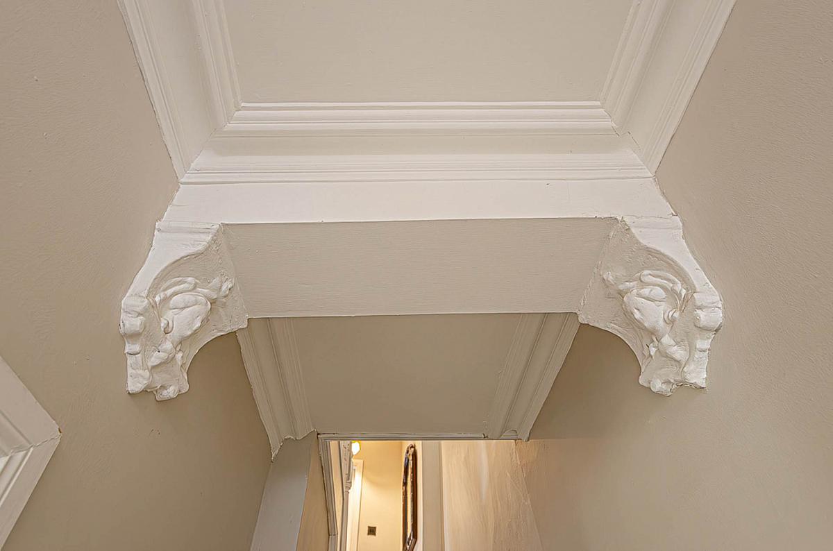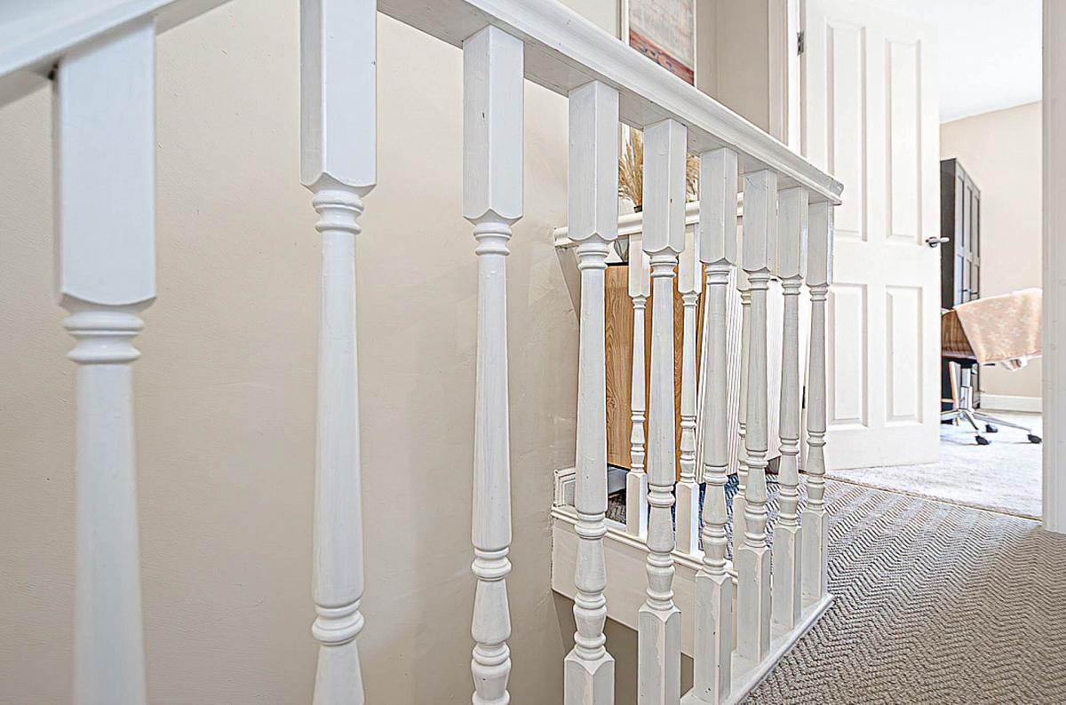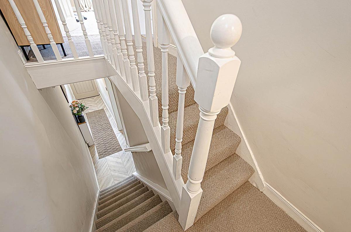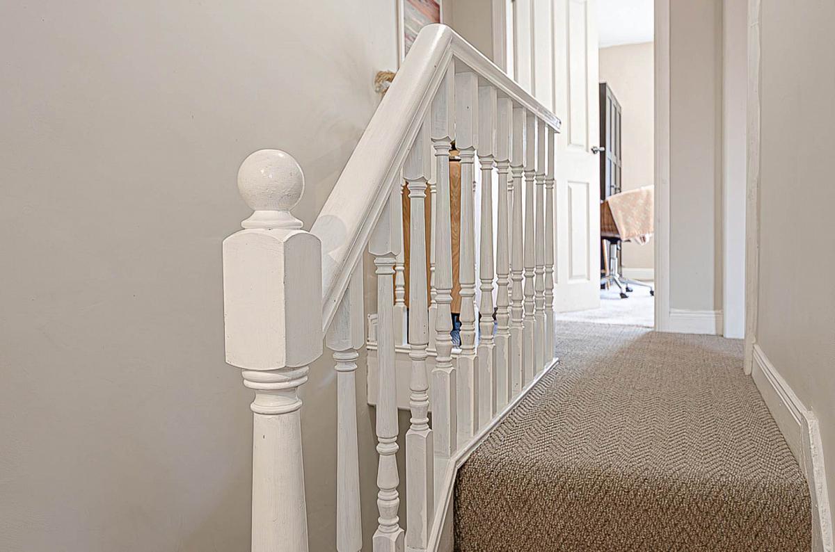 Bay window, cornice, feature fireplace, black electrical fittings, storage understairs and chevron style modern timber laminate floor