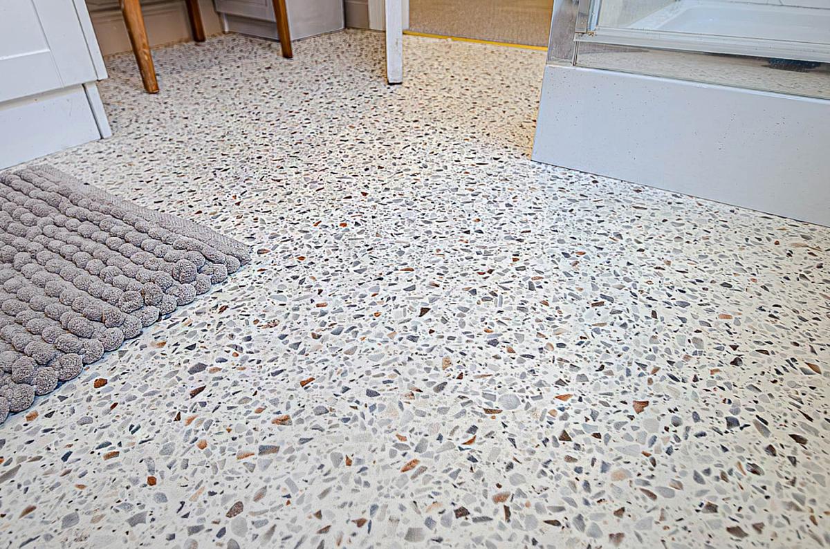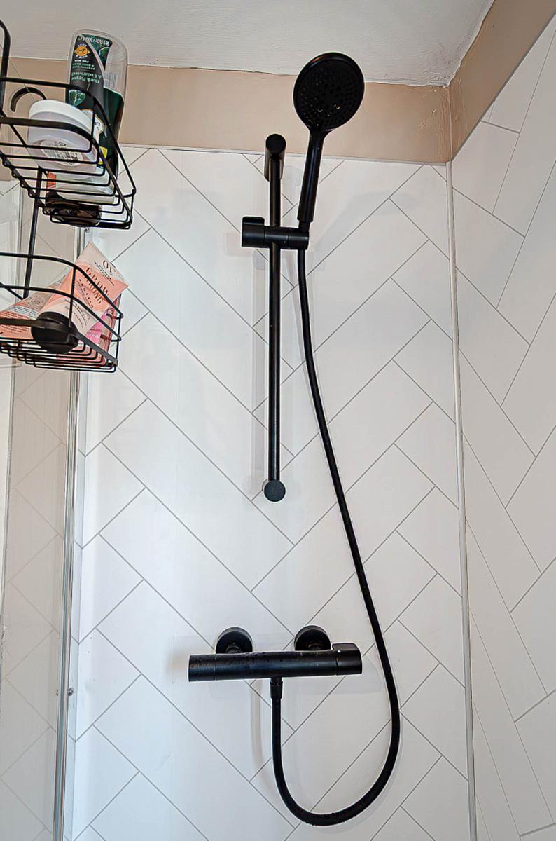 White suite - bath with black mixer taps and shower attachment, wash hand basin in white, two drawer vanity unit, W.C, separate shower cubicle with black thermostatic shower, tiled effect P.V.C. panelling, and pivot door, black towel rail, and terrazzo effect flooring