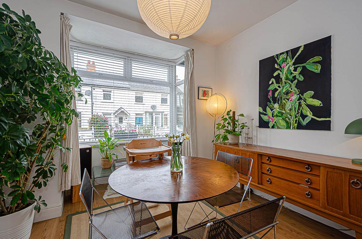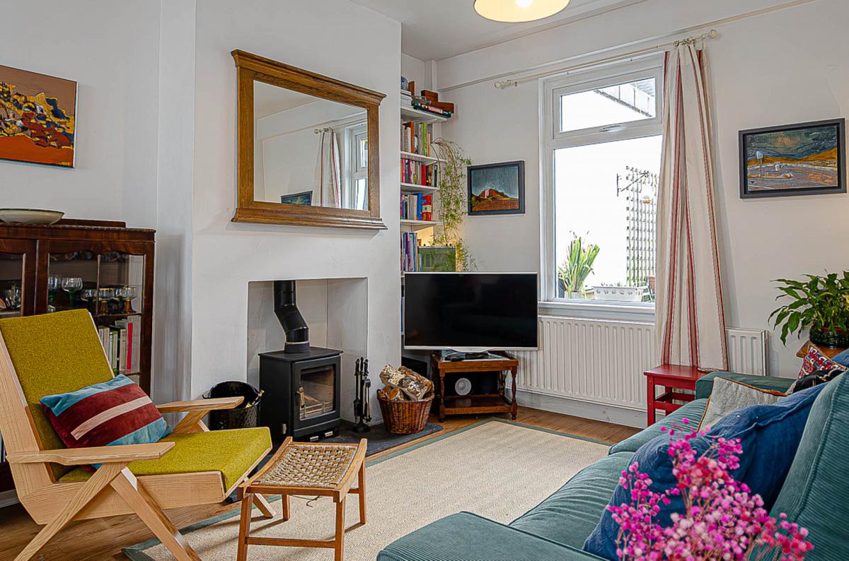 Through lounge with bay window and hole in the wall fireplace