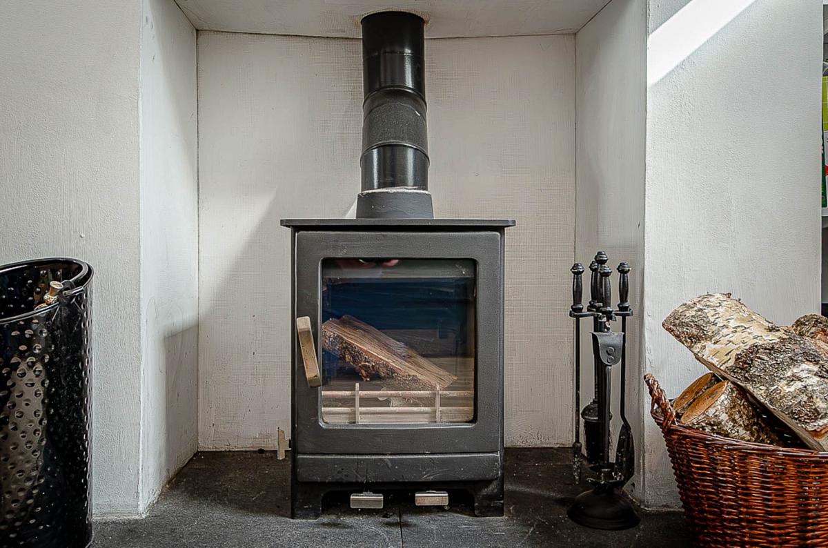 Bay window, hole in the wall fireplace with slate hearth, and timber laminate floor