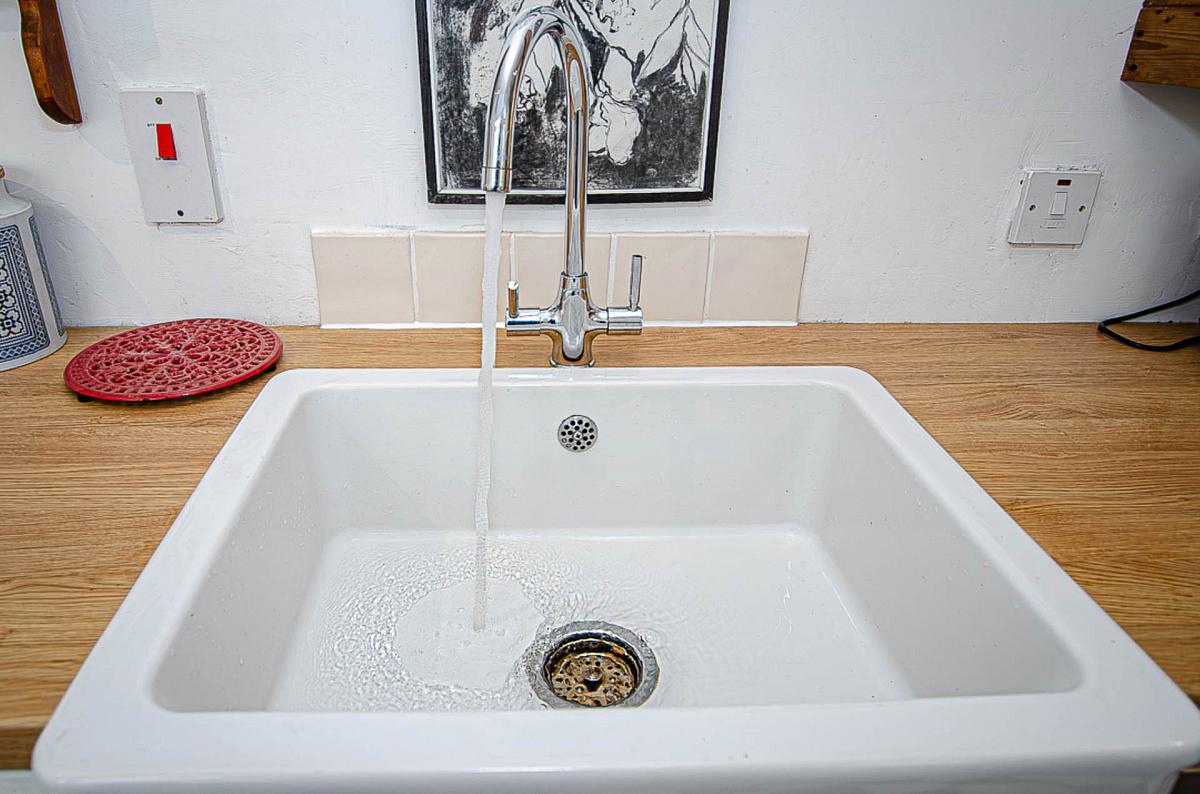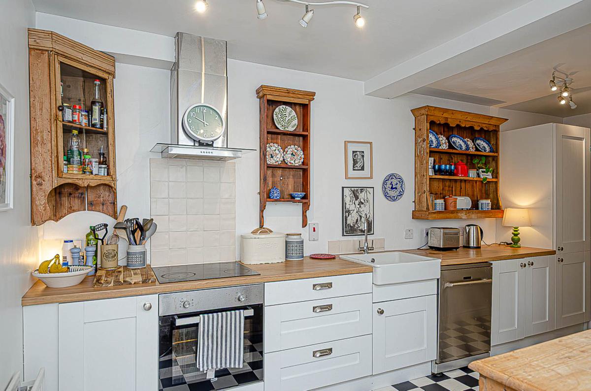 Range of high and low level units, stainless steel oven, ceramic hob, tiled splashback, stainless steel and glass extractor canopy, Belfast sink, built in shelving, spotlights, and plumbing for dishwasher