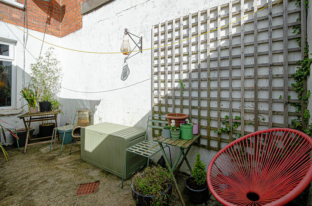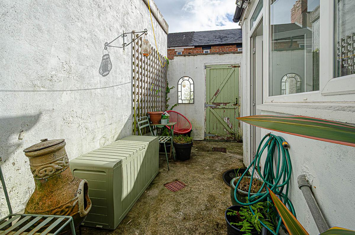 Forecourt in stones and path. Enclosed rear yard with space for sitting out and outside store (Plumbing for washing machine, space for tumble dryer and gas boiler)