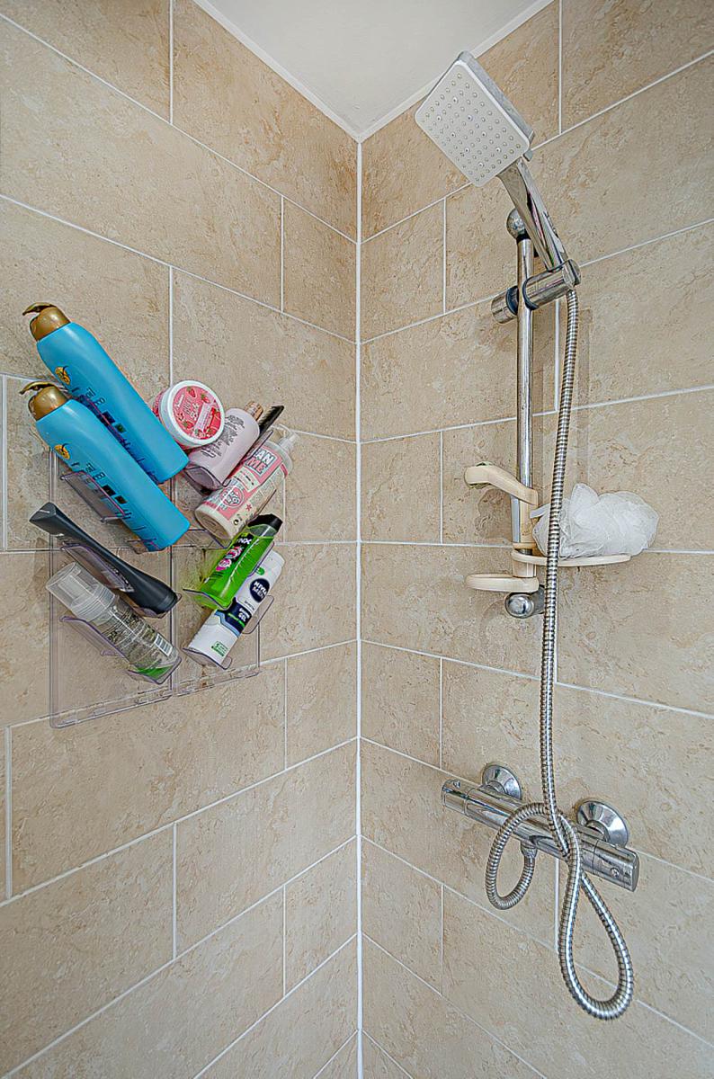 White suite - bath with tiled area, wash hand basin, W.C., part tiled shower with thermostatic shower, recessed spotlights and extractor fan