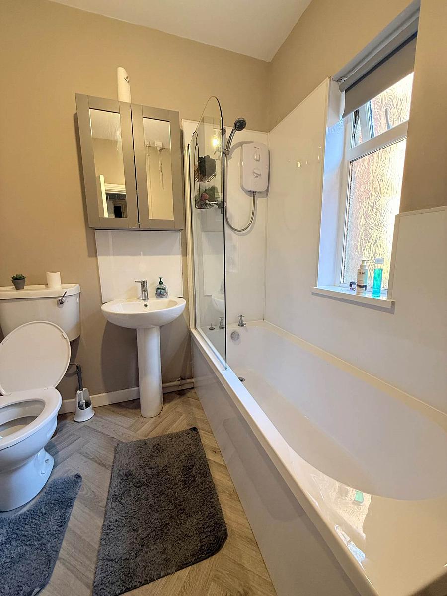 White suite with electric shower and screen over bath, wash hand basin, W.C., part PVC panelled walls, bathroom cabinet and extractor fan