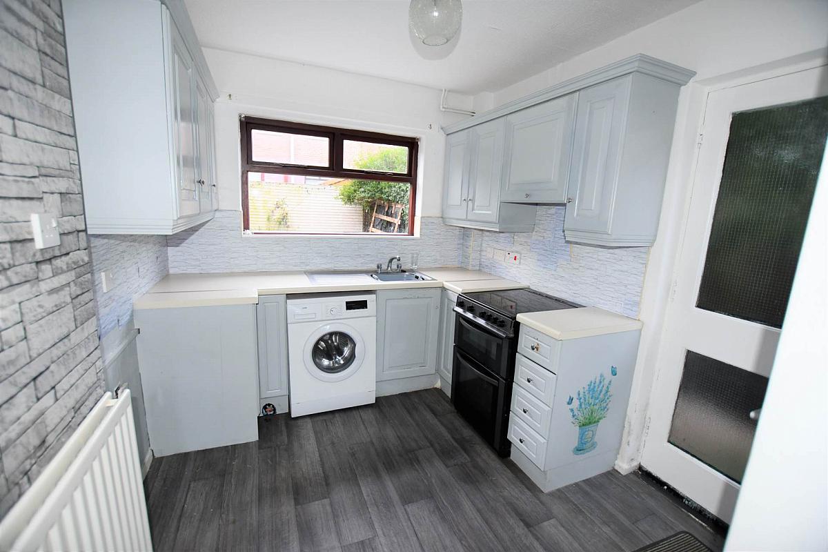 Range of built in high and low level units, single drainer stainless steel sink unit, mixer taps, plumbed for washing machine, larder.