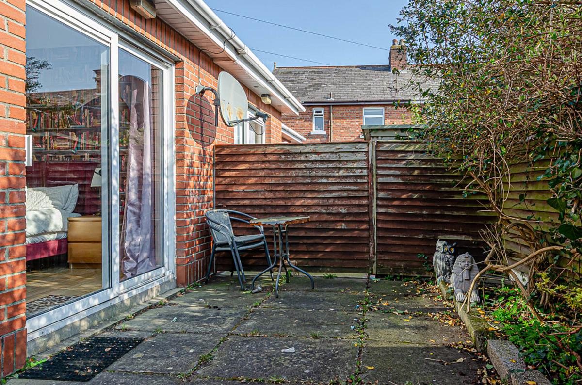 Front garden in small stones and tarmac driveway. Paved rear garden