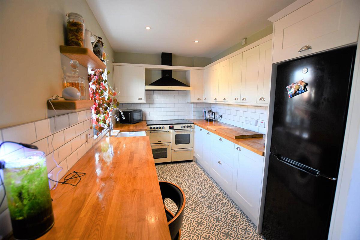 (at widest point) Belfast sink, separate instant hot water tap, superb range of fitted high and low level shaker style units, wood block work surfaces, Belling range and Belling extractor hood, plumbed for washing machine, part tiled walls, tiled floor, PVC French doors.
