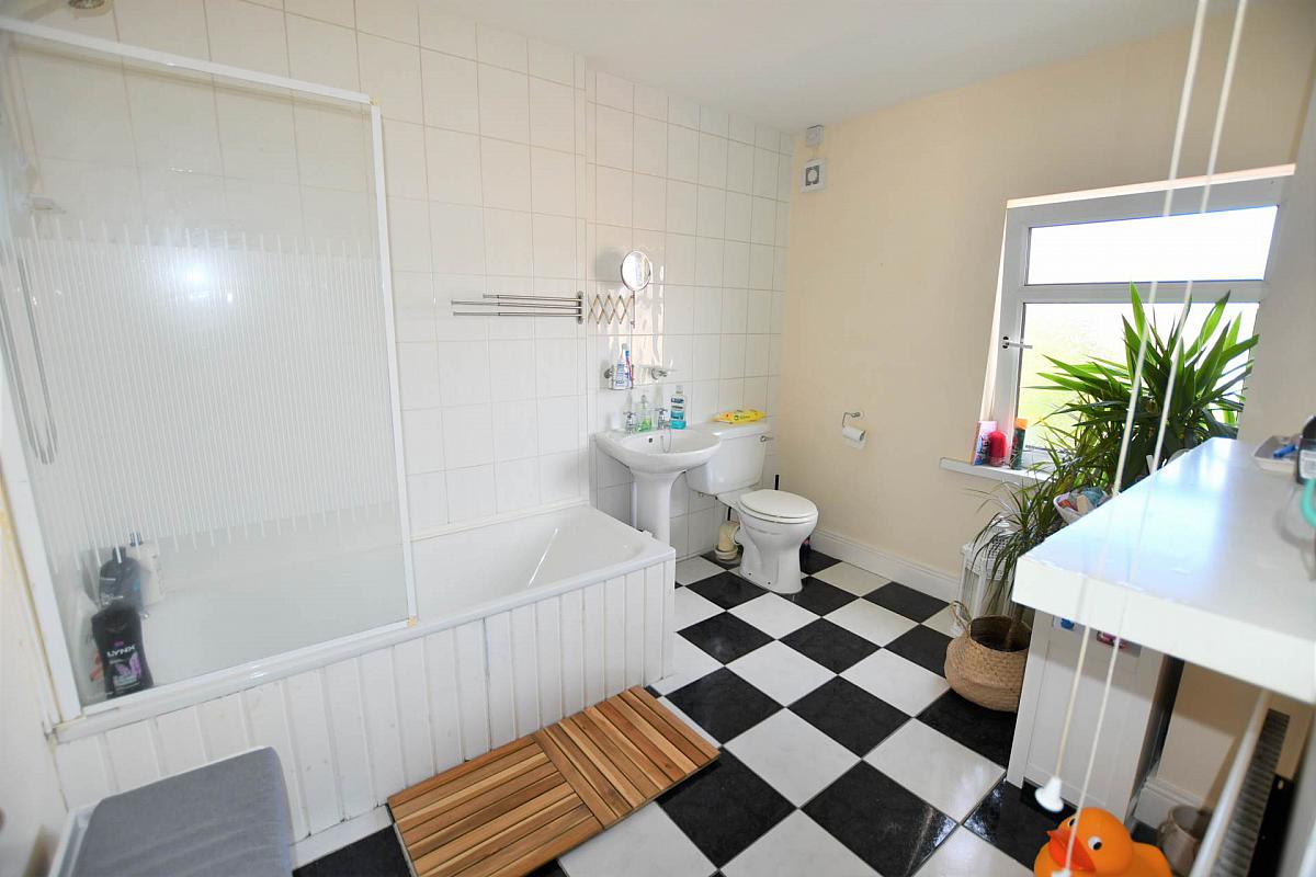 Paneled bath, electric shower, shower screen, pedestal wash hand basin, low flush w.c., tiled floor, part tiled walls.