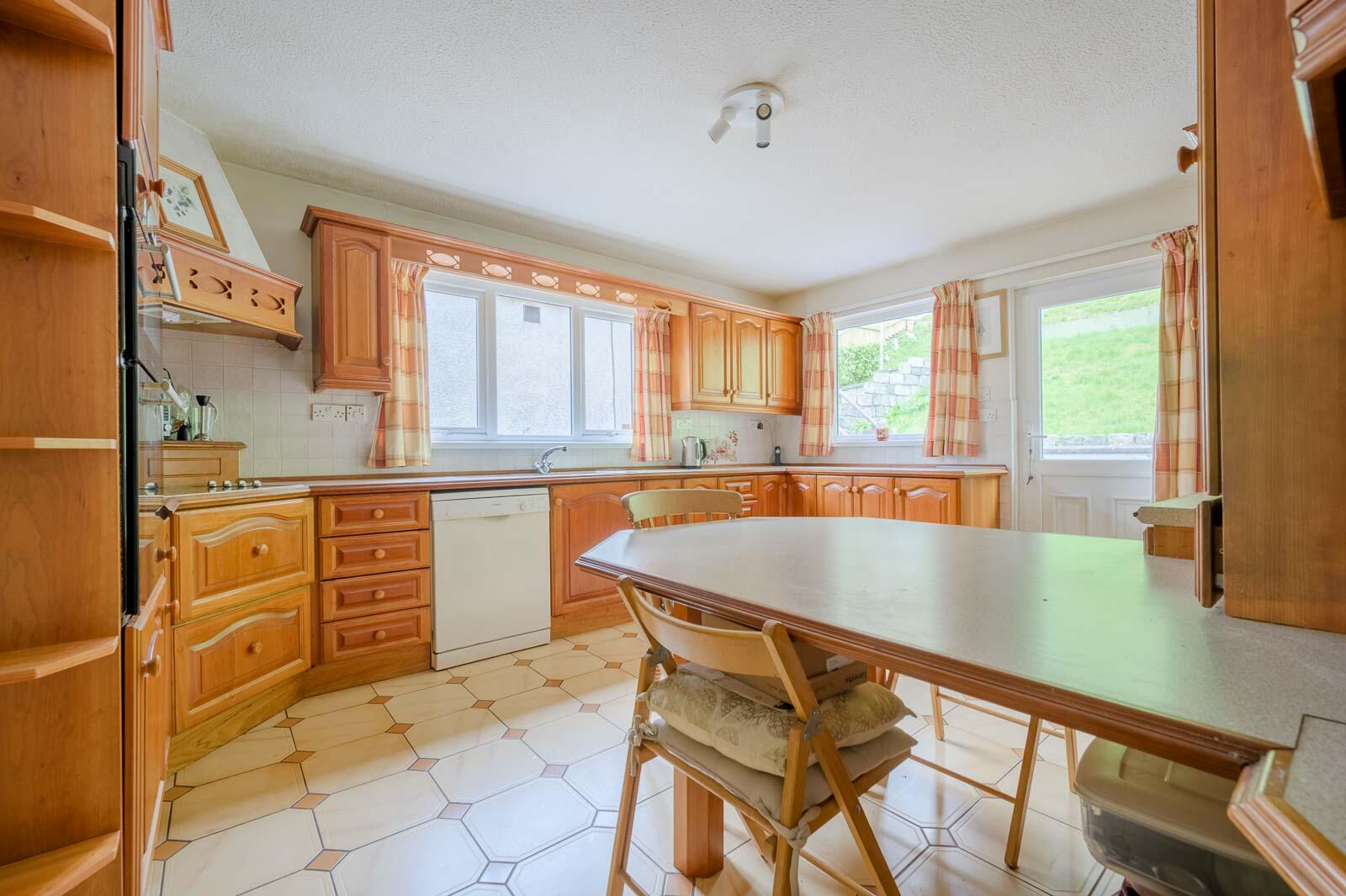 Hardwood kitchen with range of high and low level units, integrated dual oven, four ring hob, space for dishwasher, stainless steel sink and a half and drainer with chrome mixer tap, outlook to side, space for fridge freezer, peninsula dining unit, granite effect laminate work surface, uPVC and double glazed access doors to rear.