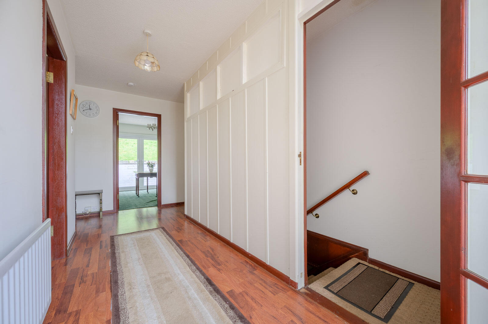 With feature floor to ceiling windows with mature outlook to front, laminate wood effect floor, staircase access down to lower ground basement. Hotpress cupboard at the end of hallway.