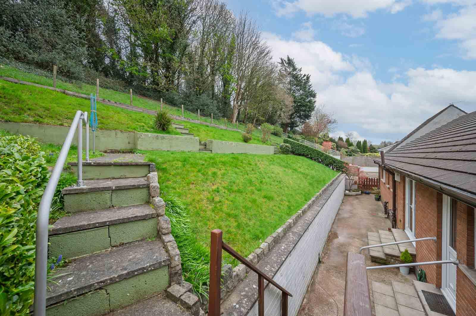 Generous rear tiered gardens laid in lawns with mature planting, ample driveway parking and mature flower beds to the front.