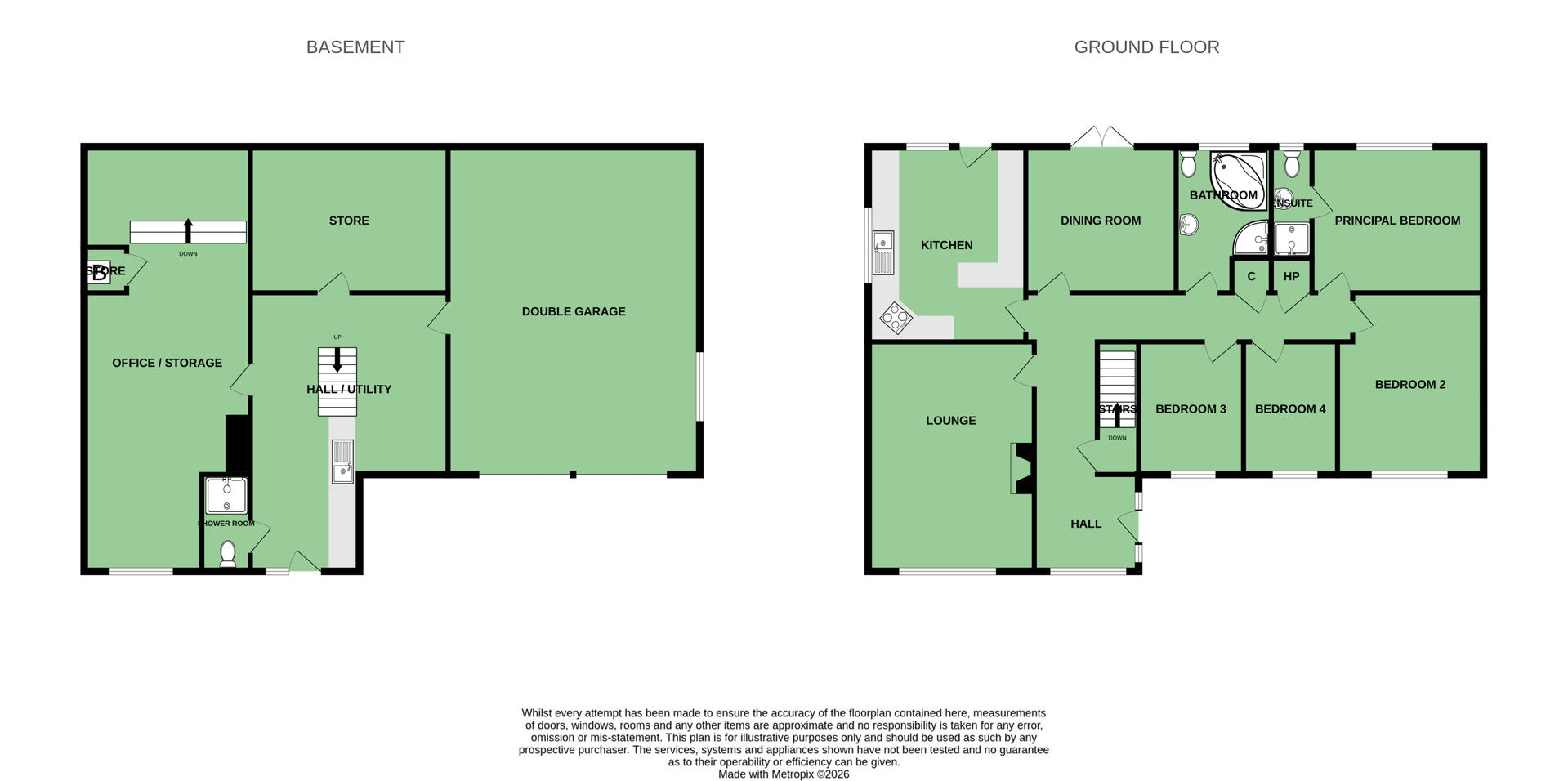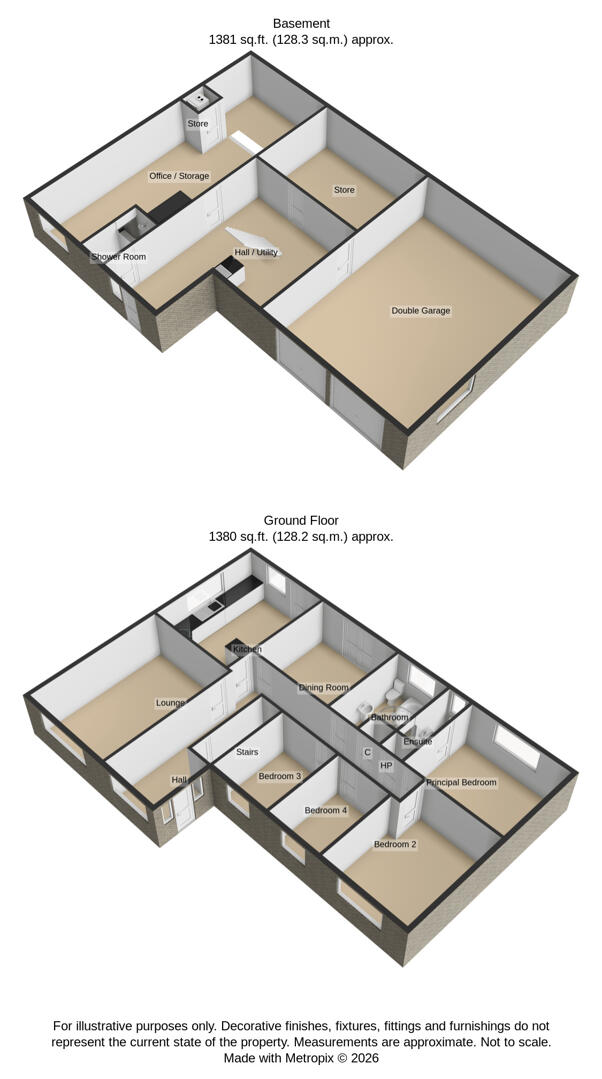 The property impresses with well-proportioned bedrooms offering flexibility for growing families, home working or guest accommodation. The layout ensures a sense of privacy while maintaining a cohesive and functional design. The basement comprises of a large utility area, shower room and series of impressive storage rooms leading to the double garage. Separate access door to basement at front of the house.