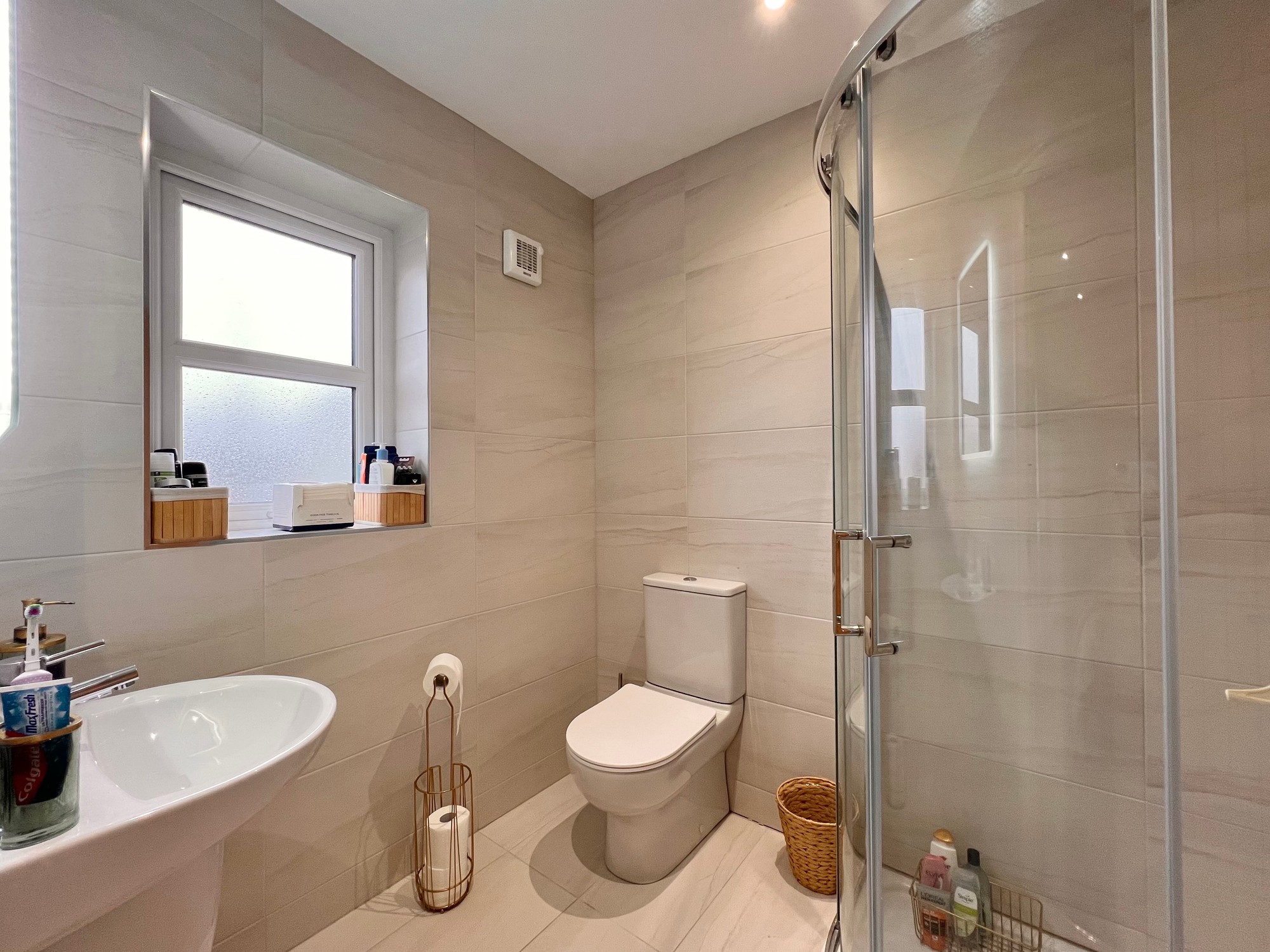 With wc, wall hung whb, illuminated mirror, shower over bath, chrome towel rail, recessed lights, walls & floor fully tiled.